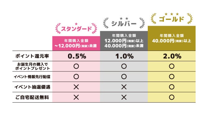 前年1月~12月までの年間ご購入金額に応じ、スタンダード・シルバー・ゴールドの3つの会員ステージのうちいずれかとなります。