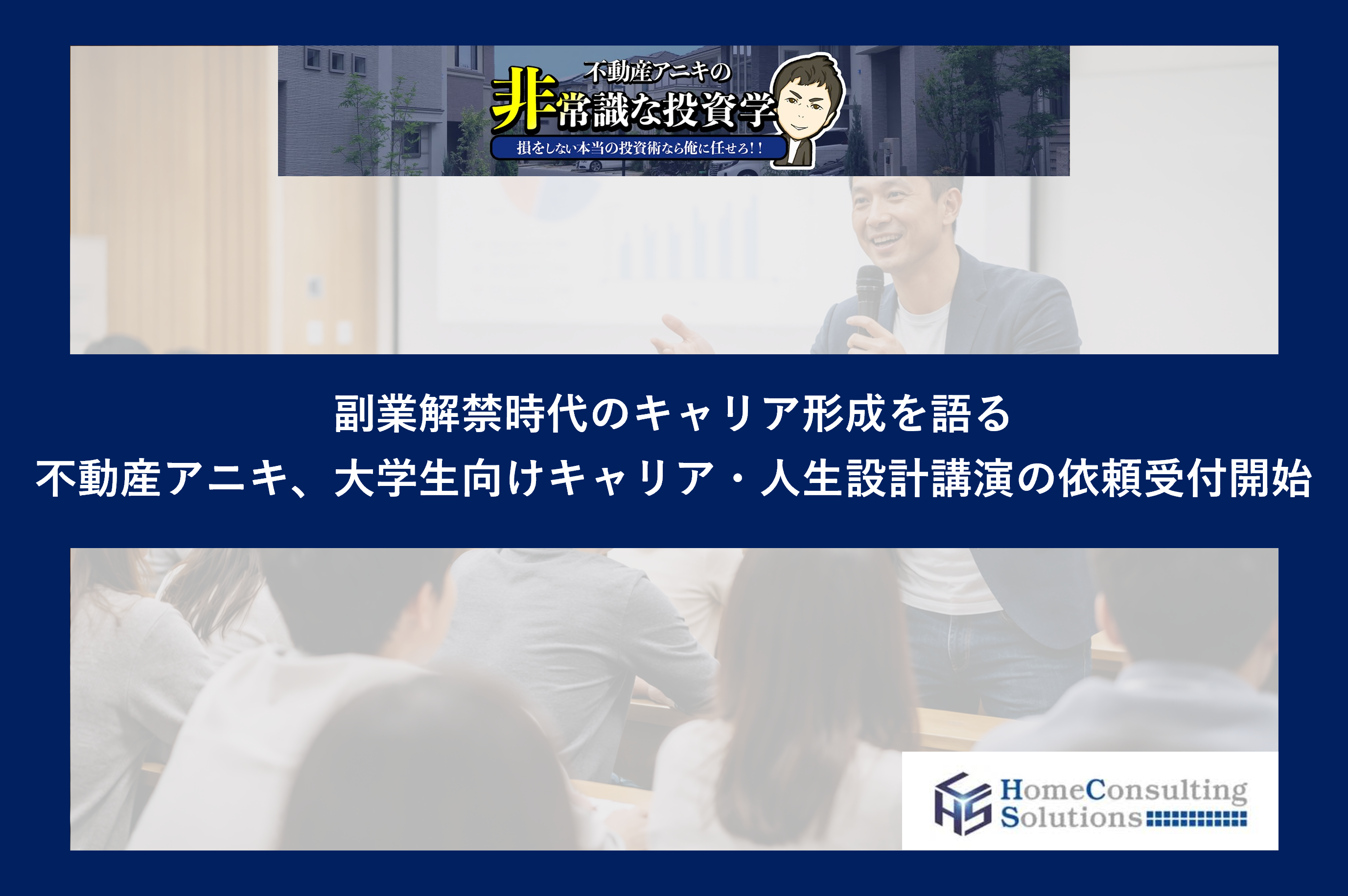 ホームコンサルティングソリューションズ株式会社(本社:愛知県名古屋市、代表取締役:小林大祐)は、YouTubeチャンネル『不動産アニキの非常識な投資学』で発信してきた知見をもとに、大学生を対象としたキャリア・人生設計講演の依頼受付を開始しました。