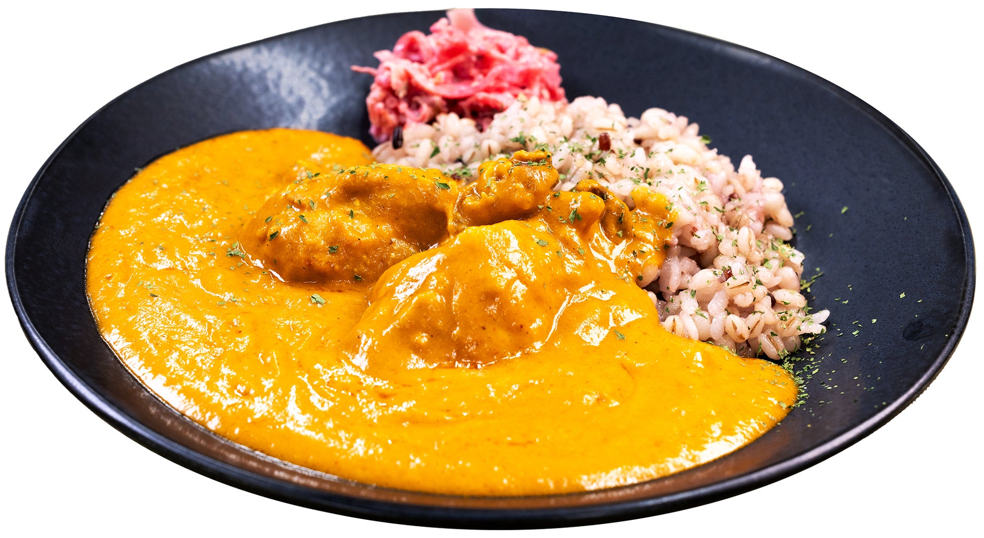 厳選したチキンに合う味わいを研究し、オリジナルブレンドした8種のスパイス(クミン・コリアンダー・陳皮・カルダモン・パプリカ・フェンネル・黒胡椒・赤唐辛子)をじっくり焙煎しバター、ソテーオニオン、トマトペーストをベースにローストカシューナッツの香ばしさを加えオリジナルカレーに仕上げました。チキンのうま味とオニオンの甘み、トマトの甘酸っぱい味わい、さらにバターのコクが加わった味わいは、世代を問わず「美味しい!」と言っていただける間違いなしの商品です。