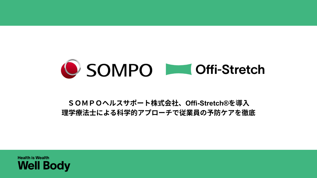 Well Body株式会社(本社:東京都渋谷区、代表取締役社長:水野 純一)は、SOMPOヘルスサポート株式会社(本社:東京都千代田区、代表取締役社長:加納 昌明)の従業員約200名を対象に、企業向けフィジカルケアサービス「Offi-Stretch®︎」(姿勢診断・慢性痛予防改善のフィジカルケア)を提供いたしました。