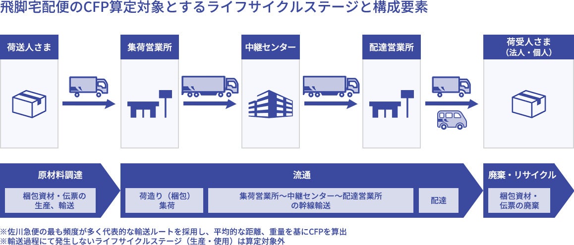 SGホールディングスグループの佐川急便株式会社(本社:京都市南区、代表取締役社長:本村 正秀、以下「佐川急便」)は、飛脚宅配便1個あたりのカーボンフットプリント(以下「CFP」※1)を算定しました。算定の結果、飛脚宅配便のライフサイクル全体を通じたCFPは、1個あたり1.25kg-CO₂e(個人向け荷物)となりました。