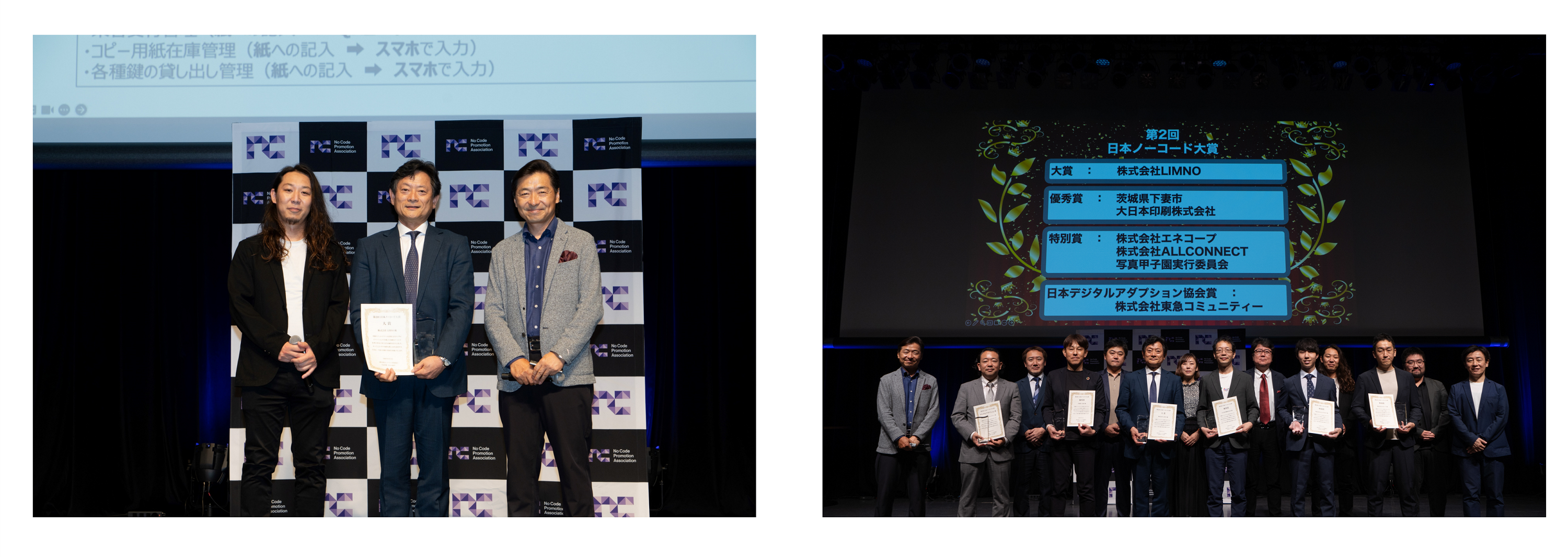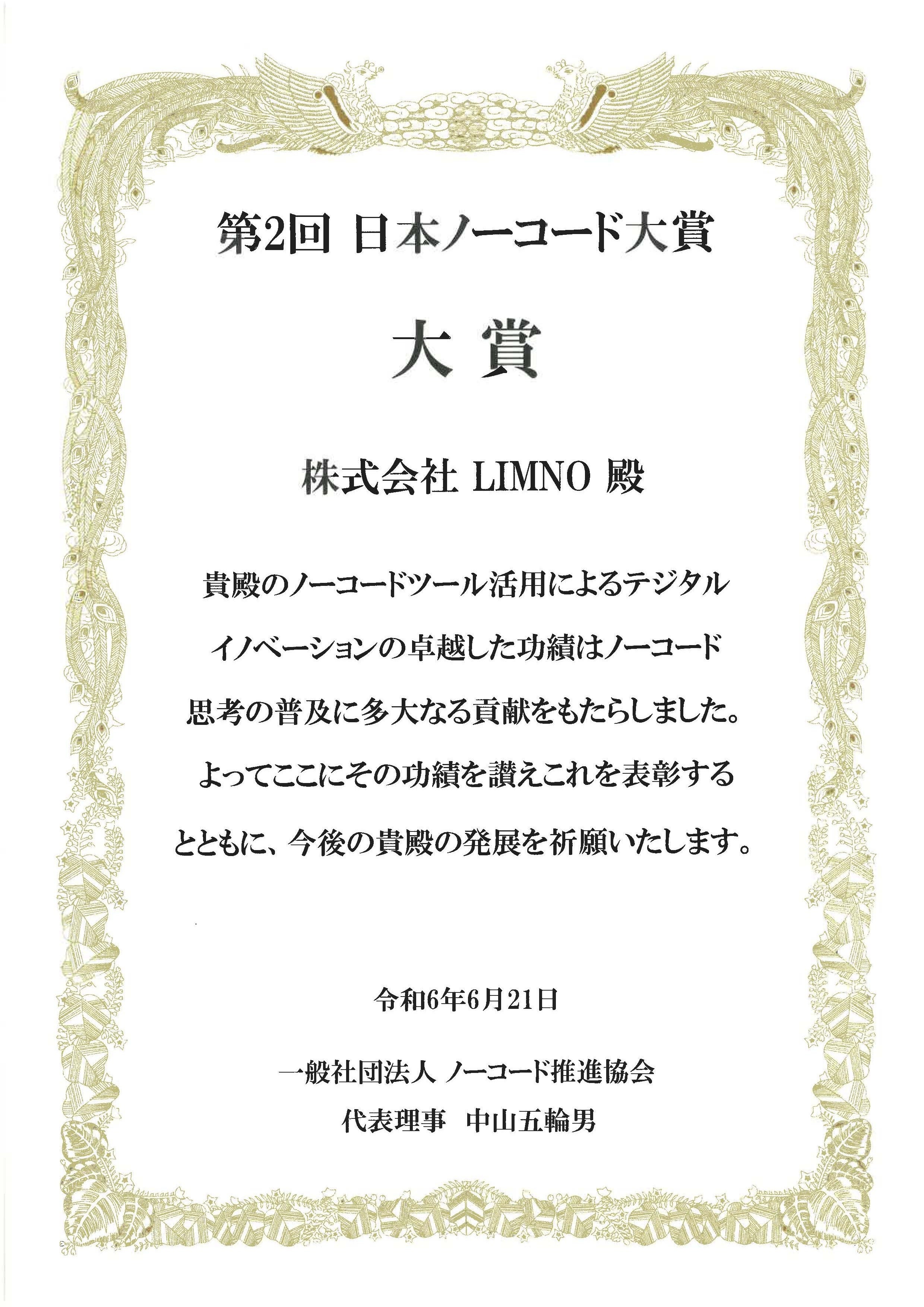 株式会社LIMNO(社長執行役員:木村裕一)は、6月21日開催の一般社団法人ノーコード推進協会(NCPA)主催「第2回日本ノーコード大賞」において、最優秀賞である大賞を受賞いたしました。本賞は、ノーコード開発手法を活用して優れたDX(デジタルトランスフォーメーション)を推進し、顕著な成果をあげた企業やプロジェクトを表彰するものです。