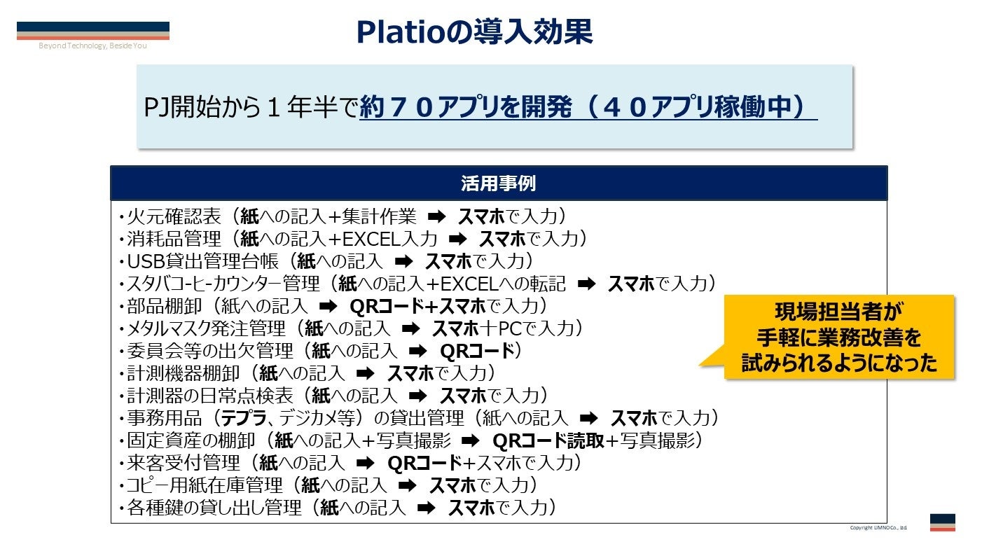「Platio」は、特別な技術知識がなくても、誰でも簡単にアプリケーションを作ってしまえるツールであり、現場の担当者が導入2ヶ月で約20種のアプリを生み出し、多岐にわたる業務プロセスの効率化とデータ化を実現しました。(現在40アプリが稼働中)