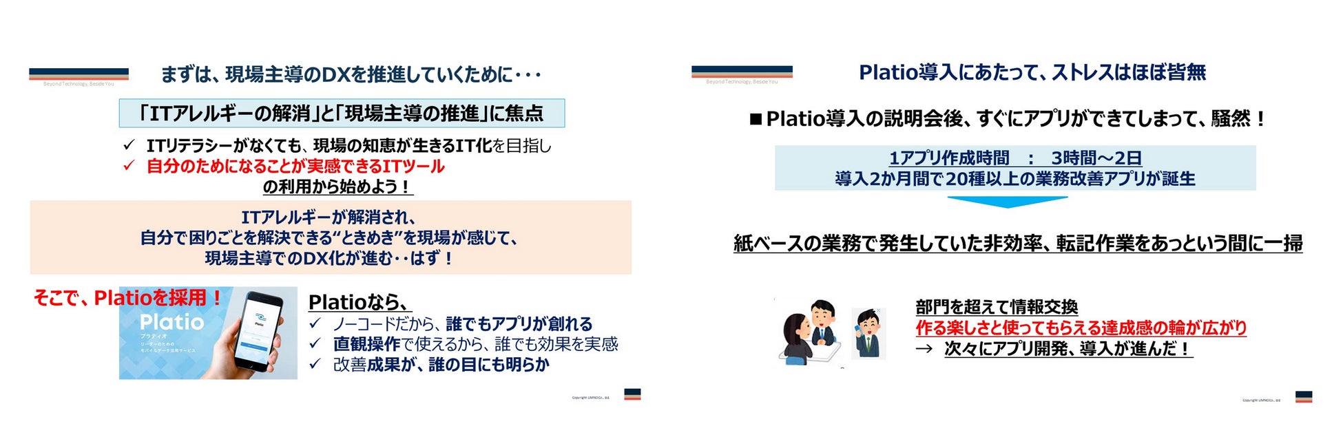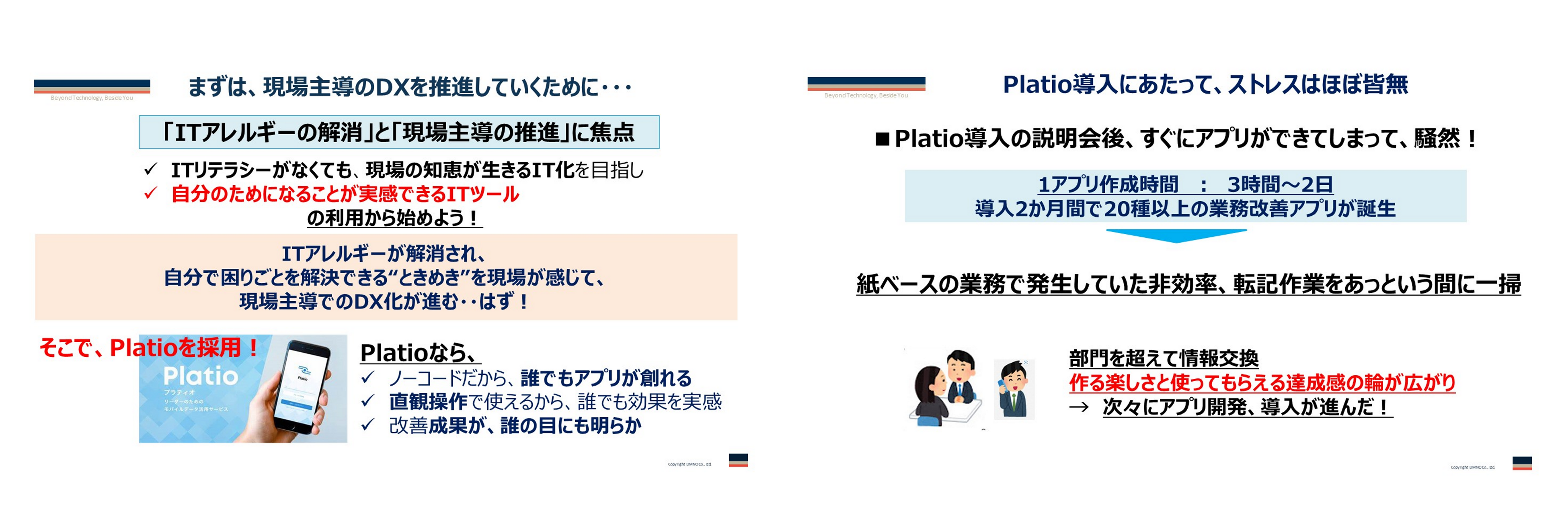 「Platio」の導入は、アプリ開発にとどまらず、社員のマインドチェンジを促し、業務プロセスの変革と効率化及び企業・組織風土の変革を実現する重要な取り組みとなっています。