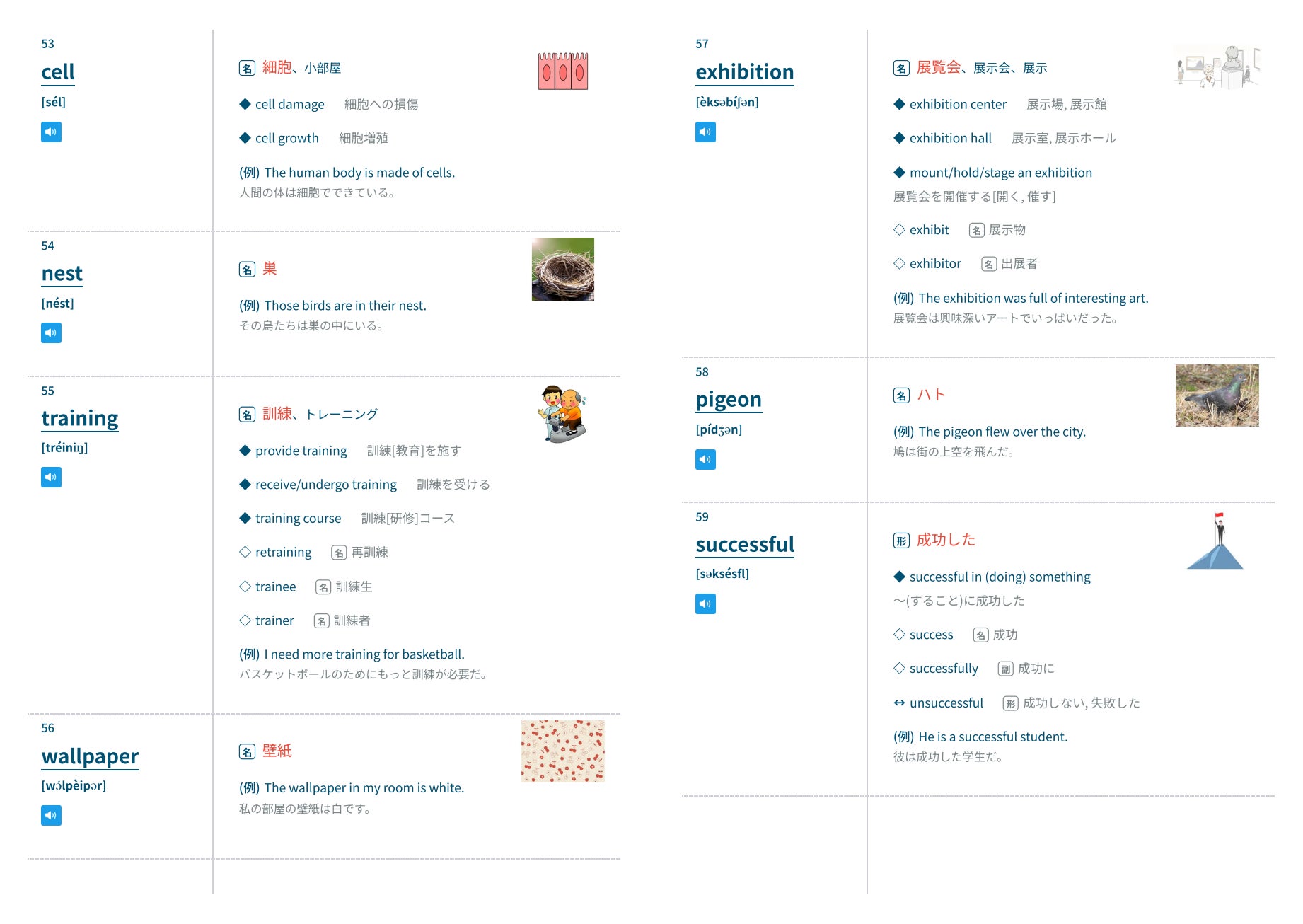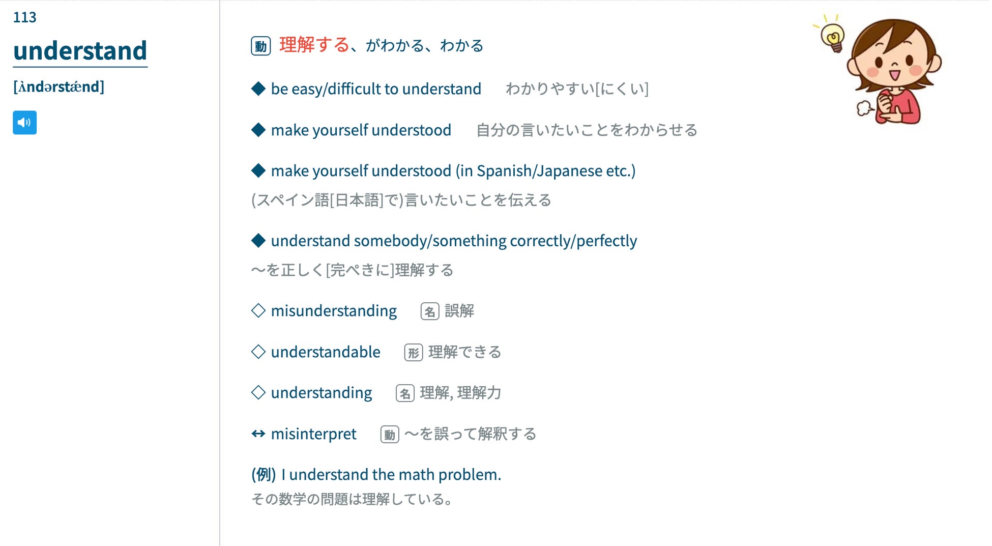 各単語帳では、英単語が重要度順に並べられ、それぞれの単語の意味・例文・画像・発音記号・音声・イメージ画像・関連語・フレーズ・類義語との違い・英英まで完備されています。様々な側面から英単語を学ぶことで、本当に「使える」記憶になるまで習熟することができます。
