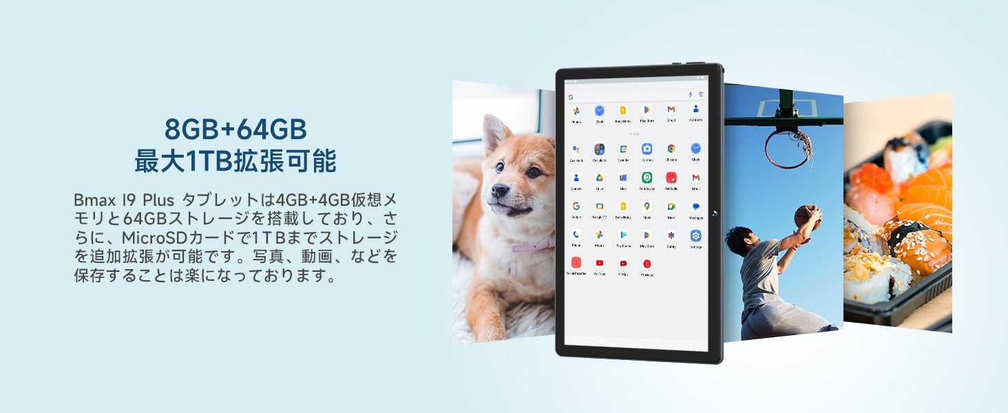 【8GB(4GB+4GB拡張)+64GB+1TB拡張可能】 I9Plus タブレットのメモリーは8GB+64GBの内蔵ストレージの元に、最大1TBまでのmicroSDカード/TF カード(FAT32フォーマットカードは別売り)の拡張可能なストレージです。容量を気にせずGoogle Playで 人気なアプリに対応でき、ビデオ、音楽、電子書籍、オンライン授業、ネットサーフィン、ゲームなど様々なエンターテイメントもこの一台で十分です。