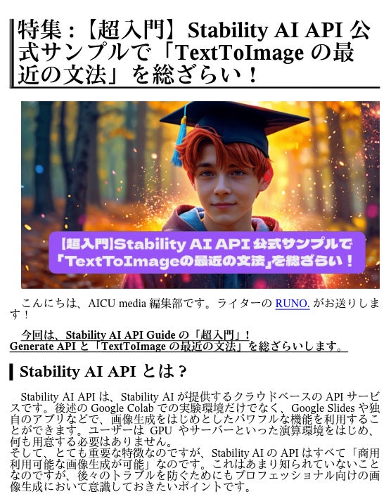 2022年8月に画像生成AI「Stable Diffusion」をStability AI が無償公開してから2年。API時代の Stability AI 入門から[次世代モデル]の予告まで。AICU創業前から歴史を記念すべく、かつ今後長年にわたって役に立つ、GPU不要でも高画質・高品質で画像生成が学べる総力特集です。