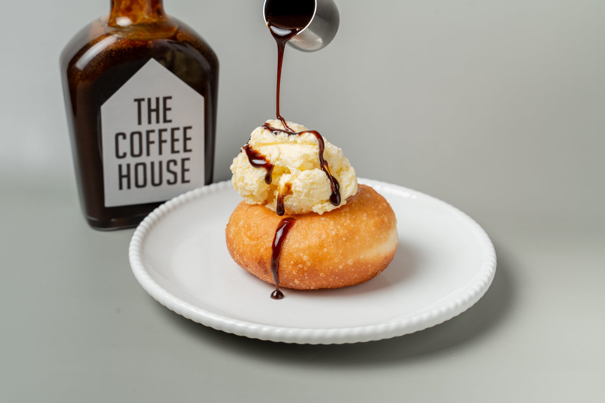 冷たいバニラアイスにふんわりミニドーナツを添え、東京・すみだ珈琲が手がけるCOFFEE SAUCEをとろりとかけたアフォガートドーナツスイーツ。