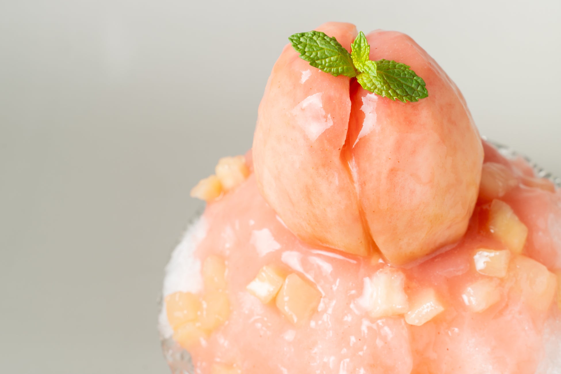 自家製の桃ジャムとシロップを氷にたっぷり染み込ませ、中にはとろけるクリーム。トップにはカスタード入りのまるごと桃を贅沢に。