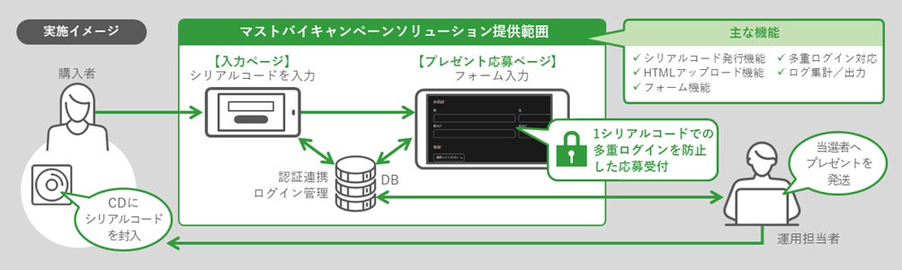 動画配信型/応募フォーム型のマストバイキャンペーンを簡単かつすぐに実施することができるサービスです。シリアルコード発行からWebページ(テンプレート)管理など、マストバイキャンペーンを行う上で必要な機能を提供します。動画配信はライブ配信・オンデマンド配信のどちらにも対応しています。