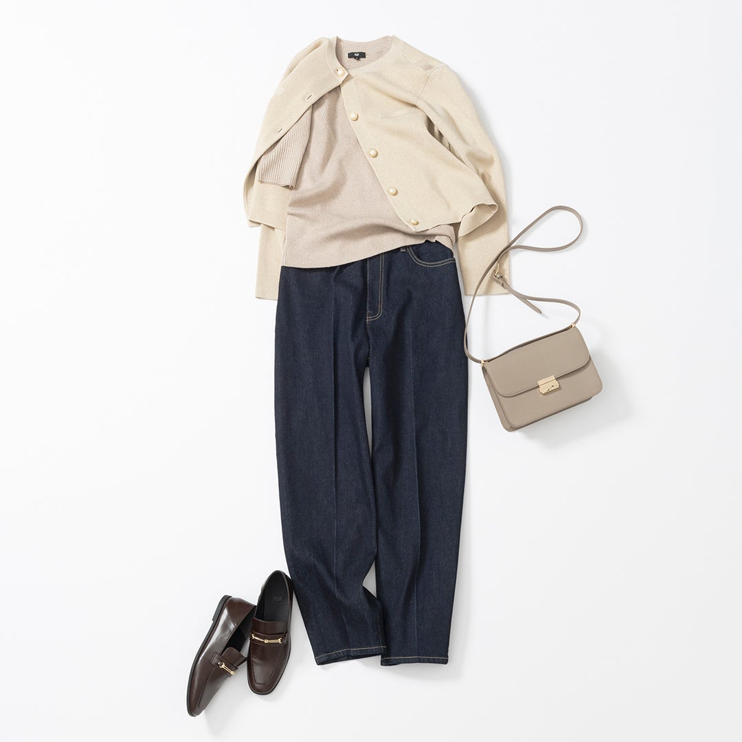 樽型のカーブパンツは、骨格ストレートにおすすめなシルエット。きちんとしたトラッドな着こなしも得意なので、ノンウォッシュのインディゴカラーがマッチします。