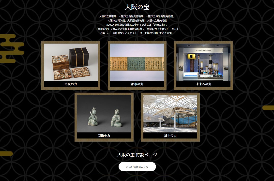 また、本ウェブサイトは、2025年の大阪・関西万博に合わせて上記6館が実施する「大阪博」のウェブサイト (https://osakahaku.ocm.osaka/) と連携しており、「大阪博」において公開する「大阪の宝」(6館が選定した収蔵品)を紹介していきます。