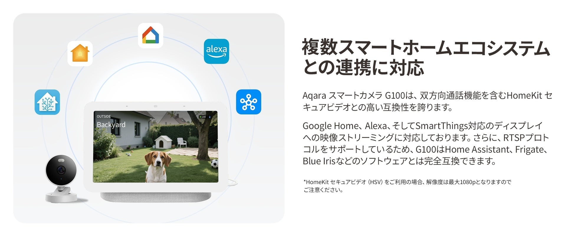 スマートカメラG100はAppleの「HomeKit Secure Video」に完全対応しており、通話やAI認識(荷物・顔など)をApple Home Hub上でローカル処理することが可能です。さらにiCloud契約をしている場合、追加費用なしで録画データを保存できるほか、Apple TVとの親和性も高くAppleエコシステムへの統合もスムーズです。また、Home Assistant、Frigate、Blue Irisなどのソフトウェアへのリアルタイム映像配信も可能です。Google Home、Amazon Alexa、SmartThings対応のスマートディスプレイへの映像ストリーミングにも対応し、他のスマートホーム製品と幅広く連携できることで手軽にスマートホーム拡張をしていただけます。