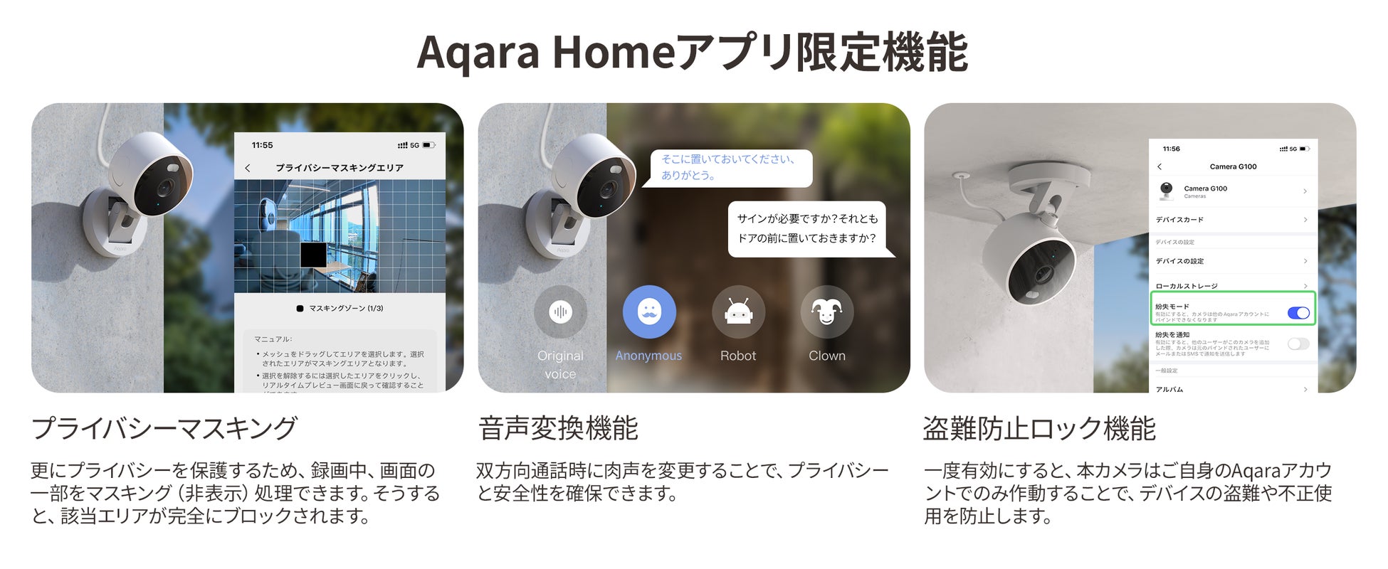 Aqara Homeアプリと連携することで、多彩な機能の活用もスマートカメラG100で可能になります。指定範囲を非表示にできる「プライバシーマスキング」機能では、生活空間や近隣の敷地など映したくないエリアを隠すことができます。また通話時の「音声変換」機能も搭載し、子どもや高齢者の安全性を高めることも可能です。その他、イベント発生時に映像を自動記録する「統合イベント機能」や、本体の初期化を無効化しアプリからのみ解除が可能な「紛失モード」など、第三者の不正利用を防止して安心に利用することができます。