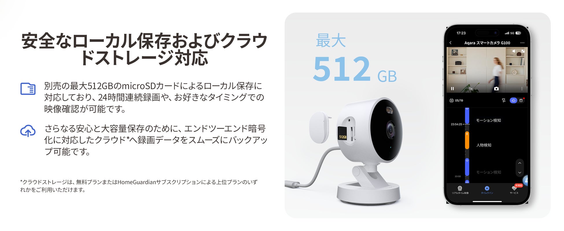 本体に搭載しているmicroSDカードスロットは最大512GBの容量があり定点での常時録画が可能です。記録された映像はNAS(SMB対応)への自動バックアップにも対応しているためローカルでのデータ管理も実現できます。また映像を約15秒に短縮してまとめる「タイムラプス機能」も搭載。AIによって検知されなかった時間帯も様子が確認でき、確認作業も効率化します。さらに、Aqara独自のクラウドサービス「HomeGuardian」では、エンドツーエンド暗号化でプライバシーをしっかり守り、権限を持つ人だけが録画データにアクセス可能です。また、Appleの「HomeKit Secure Video」で利用する際にはiCloudでのクラウド保存も利用できます。プライバシーを重視しつつ、手軽にクラウド保存を試したい方にも最適です。