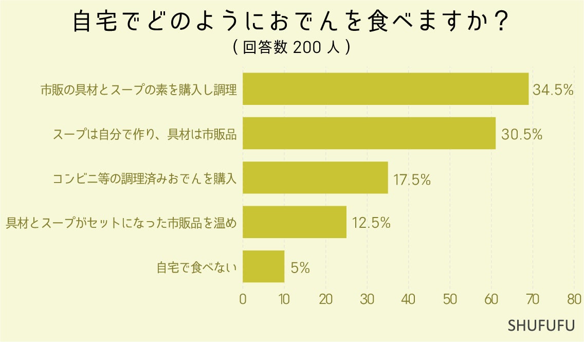 自宅でどのようにおでんを食べるかについては「市販の具材とスープの素を購入し調理」が一番多い回答でした。
