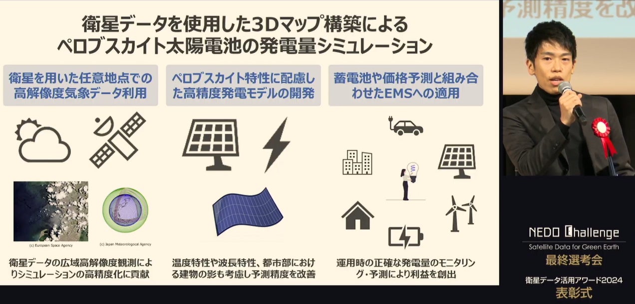 「衛星データを使用した3Dマップ構築によるぺロブスカイト太陽電池の発電量シミュレーション」が高く評価される