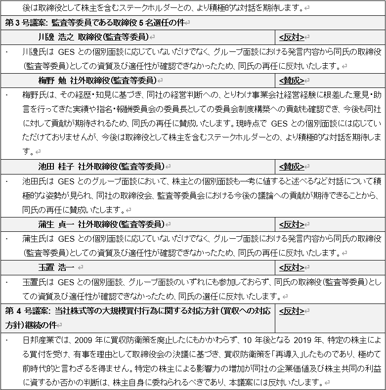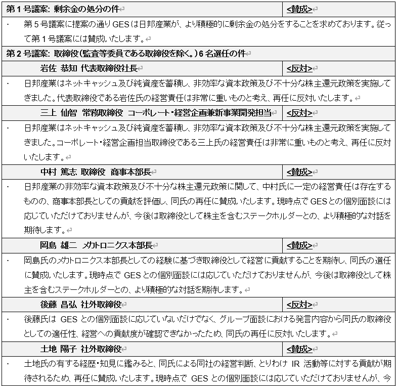 日邦産業株式会社の株主総会におけるGlobal ESG Strategyの議決権行使方針に関する事前開示