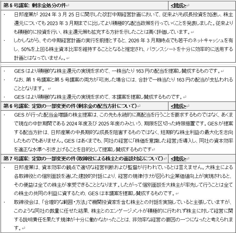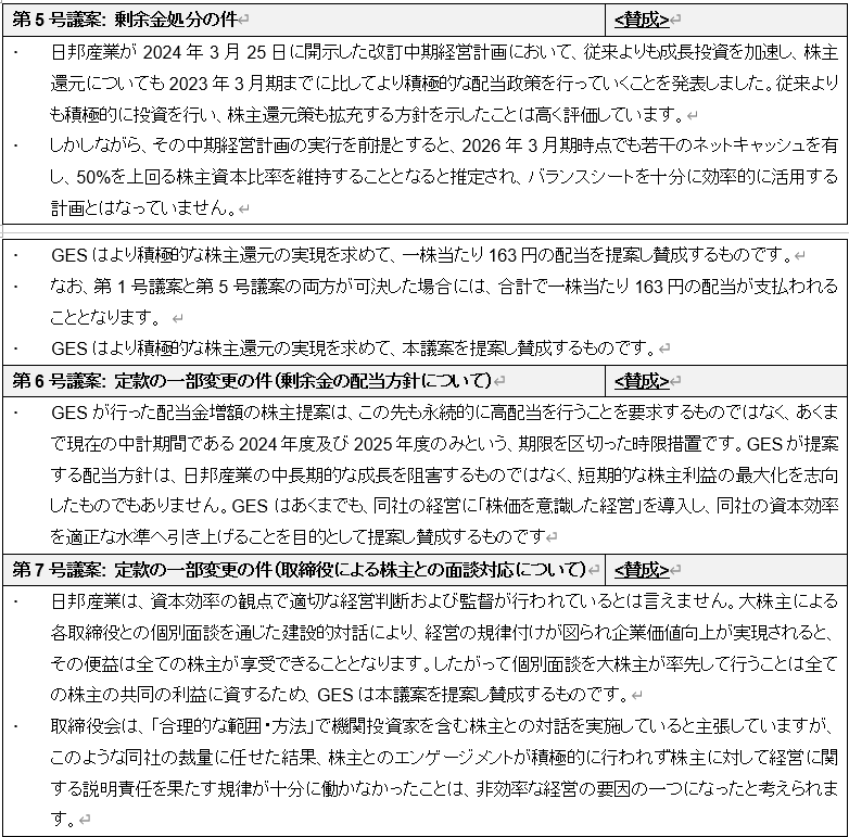 GESの株主提案第5号議案~第7号議案については全て賛成します。株主の皆様においても株主提案議案全てについて賛成頂くようお願いします。