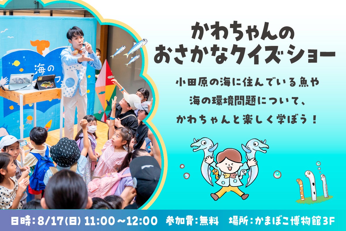 さかなのおにいさん かわちゃんによる「環境問題と魚食」をテーマにしたおさかなクイズショーを開催します。クイズショーは、相模湾を泳ぐ魚や、かまぼこになる魚のクイズに挑戦しながら魚の“オモロい”生態を楽しく学ぶことができます。さかなのおにいさん かわちゃんのアップテンポで楽しいクイズショーを通じて、海を大切にしながらお魚を日々食べることの大切さを体感できるイベントです。