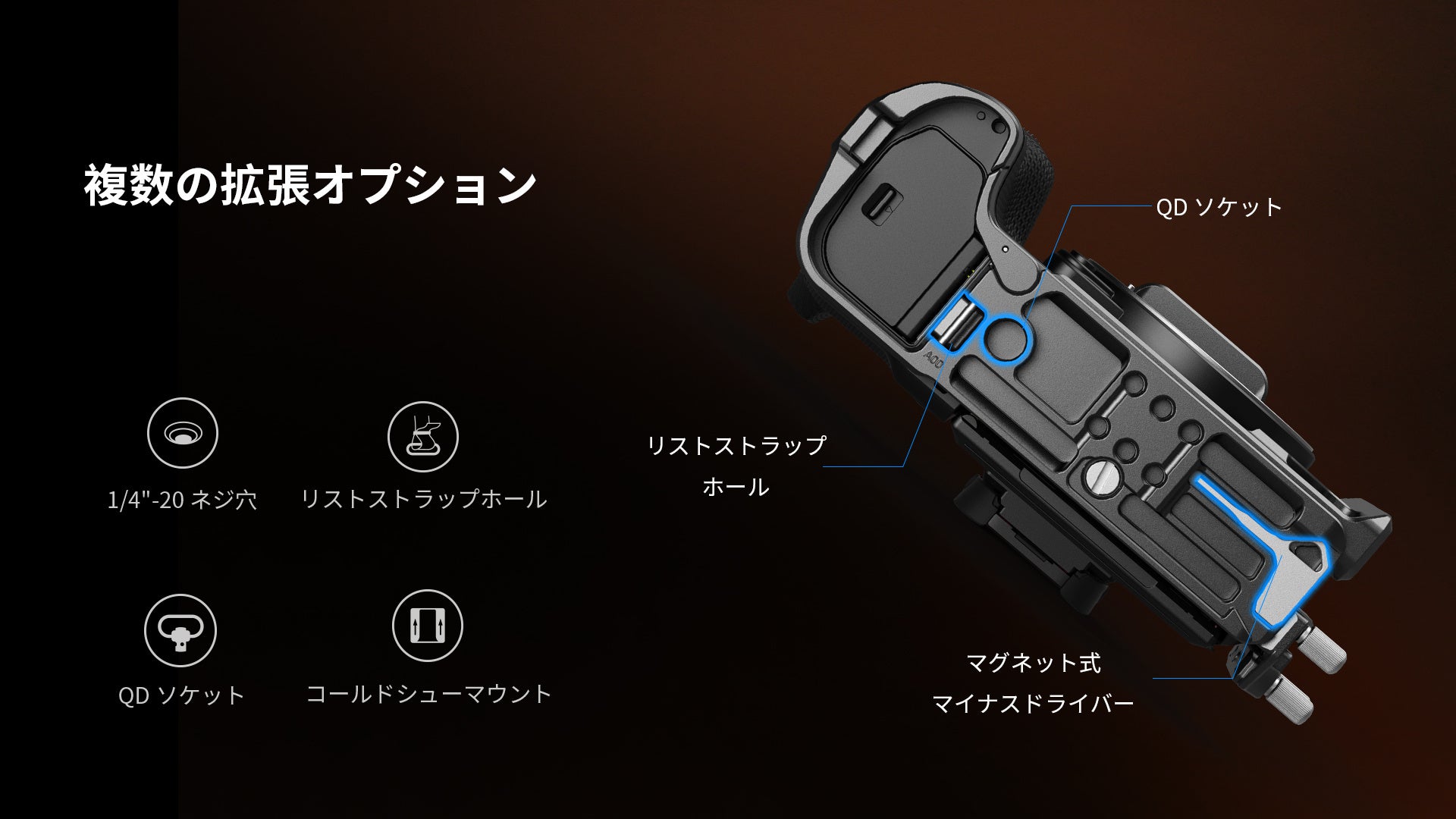 3点ロックシステムを採用し、捻りを防止します。柔らかいシリコンコーティングを施し、カメラを傷から守ることができます。内蔵のマグネット式マイナスドライバーでリグの組み立てと分解がより簡単になります。1/4"-20ネジ穴、3/8"-16ネジ穴、QDソケット、リストストラップホール、コールドシューマウントなど、複数の拡張インターフェースを豊富に用意しており、さまざまな撮影シーンに対応できます。