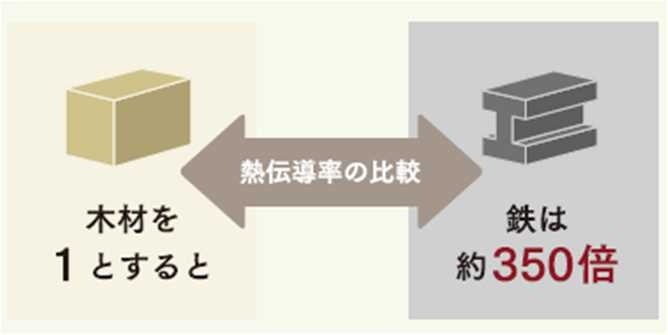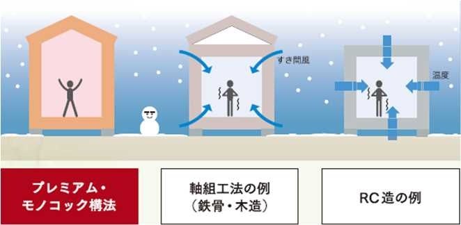 「木」は断熱性能が高く、熱伝導率は「鉄」の約350 分の1となります。この優れた断熱性能をもつ「木」を構造材に用い、枠組壁工法(ツーバイフォー工法)を日本の気候・風土あわせ独自に進化させた「プレミアム・モノコック構法」にり、省エネルギー性能の高い建物を実現しています。