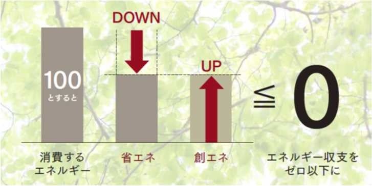 * 断熱性を高め、省エネ設備を選択することで、住まいで使うエネルギーを減らす。創エネ設備を搭載し、使うエネルギーよりも多くのエネルギーを生み出す。そのように、一次エネルギー消費量の収支をゼロ以下とすることを目指した住まいがZEHです。