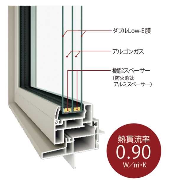 サッシは3 枚のガラスを2 つの空気層で区切った構造になっています。ガラスにはLow-E コーティングが施されており、熱放射線を反射して屋内への熱の侵入や流出を防ぎます。空気層はアルゴンガスが充填されており、熱伝導率を低く抑えます。窓から住宅を高断熱化することで、エネルギーの消費の削減はもちろん、室内の温熱環境を改善するとともに、結露の発生を抑制し、カビや腐食のリスクを低減することができます。