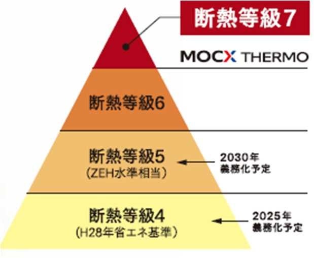 「MOCX THERMO」の性能は、断熱性能を表すUA 値において、驚異的な0.26W/(㎡・K)を達成しており、外気温の影響を受けにく、心地よい室温を保つ超快適空間を生みだします。以下のような仕様により、「断熱等級7」の基準をクリアします。