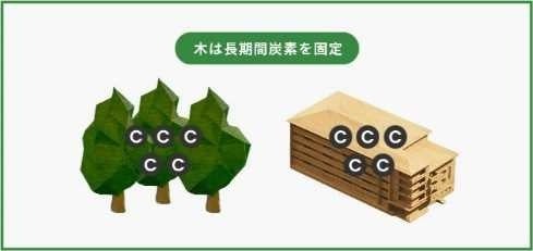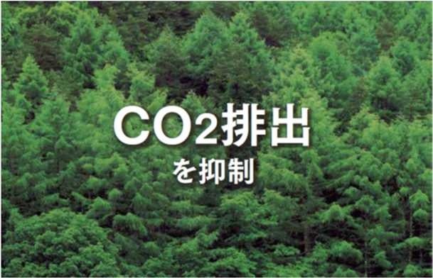 サステナブルな循環型資源である木は、適切な森林管理によって持続的に再生産が可能な資源です。また、生長過程で CO2 を吸収し、伐採後も炭素を固定化し続けるため、木造建築は長期間炭素を大気に戻さない事に加え、伐採地に植林されることでCO2 吸収力は回復され、地球温暖化防止に貢献します。