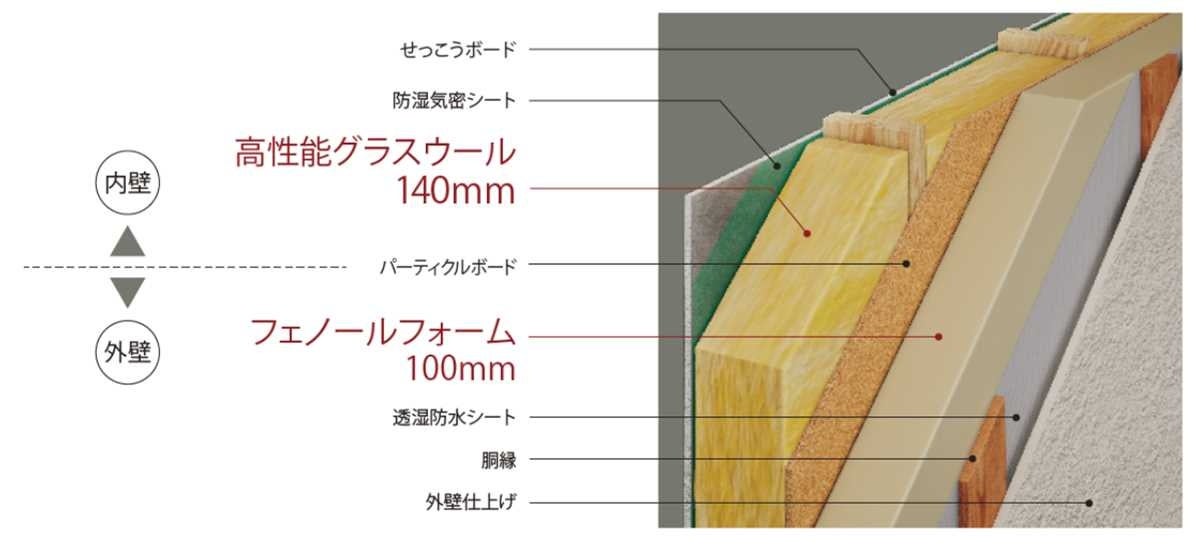当社の標準仕様である高性能グラスウールを壁内側に140mm の厚さで充填していることに加え、壁外側に100mm のフェノールフォームを採用することとしました。これにより、断熱性能は飛躍的に向上します。