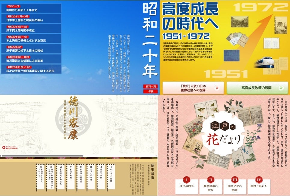 終戦により大きな転換点を迎えた昭和20年の出来事を月ごとに紹介する「昭和二十年」や国内の復興を進めるとともに国際社会への復帰を果たし、やがて劇的な経済成長をとげた時代をたどる「高度成長の時代へ」、徳川家康の事績を将軍家の蔵書からみる「徳川家康」、植物図譜や園芸書から江戸時代の人々の植物へのまなざしを紹介する「江戸の花だより」など、様々な時代・ジャンルの展示会をご覧いただけます。