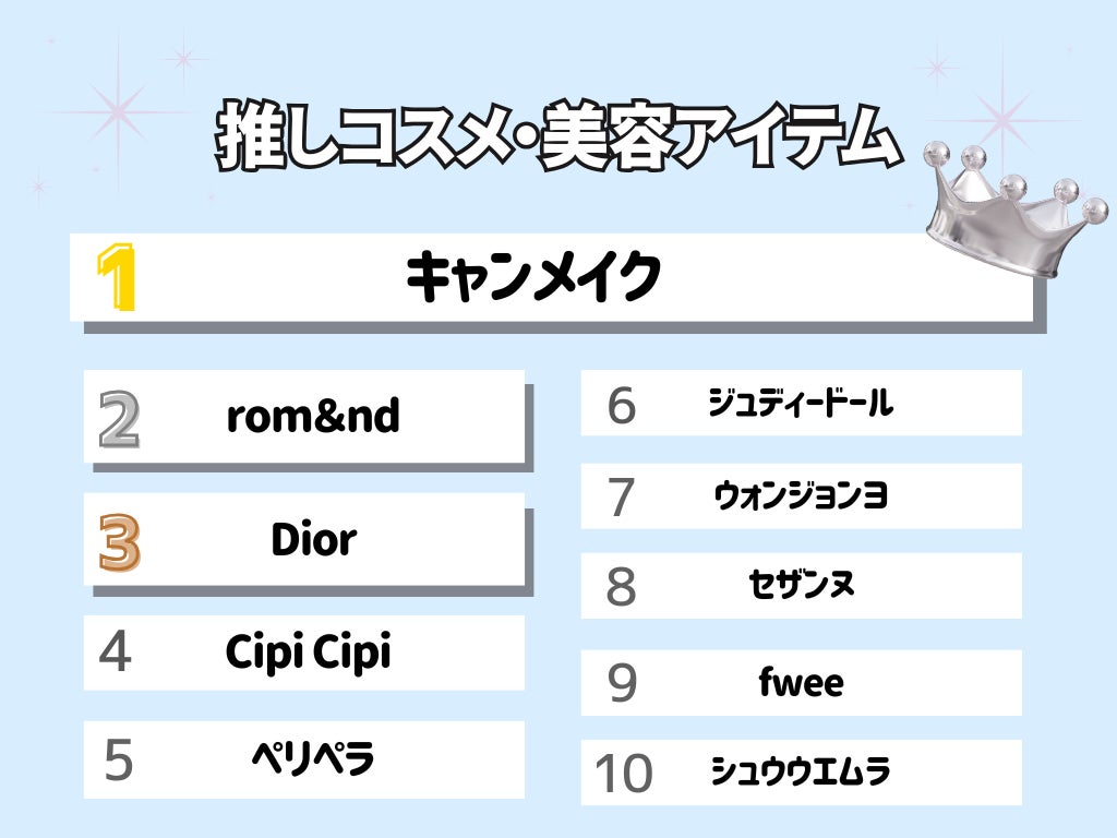 推しコスメ・美容アイテムランキングでは、キャンメイクやロムアンド、CipiCipiといったプチプラブランドが高い支持を集めました。加えて、ディオールやシュウウエムラなどのハイブランドもランクインしており、価格帯の異なるアイテムをシーンや目的によって使い分ける傾向が見られます。Z世代は、パッケージデザインや発色、使用感といった要素を総合的に評価し、自分に合った“推せる”アイテムを選んでいるようです。