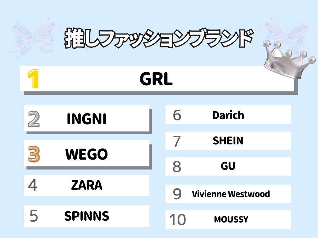 推しファッションブランドランキングでは、GLRやINGNI、WEGOといった若年層に支持される国内ブランドが上位を占める一方、ZARAやSHEIN、GUといったグローバルかつ手頃な価格帯のブランドも人気を集めています。多様なブランドがランクインしていることから、女子高生のファッション志向がトレンド性とコスパのバランスを重視しつつ、多様化している様子がうかがえます。