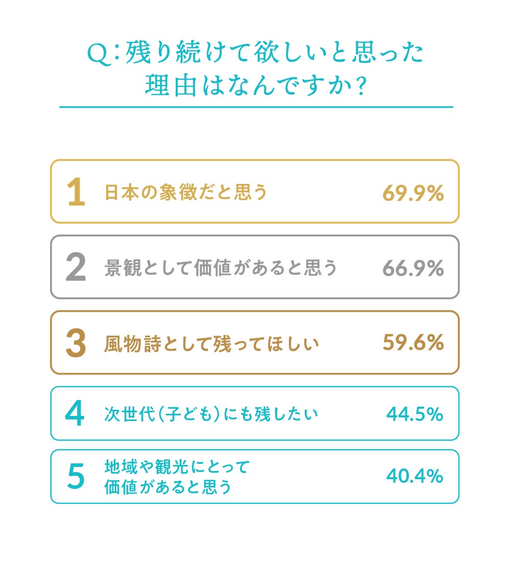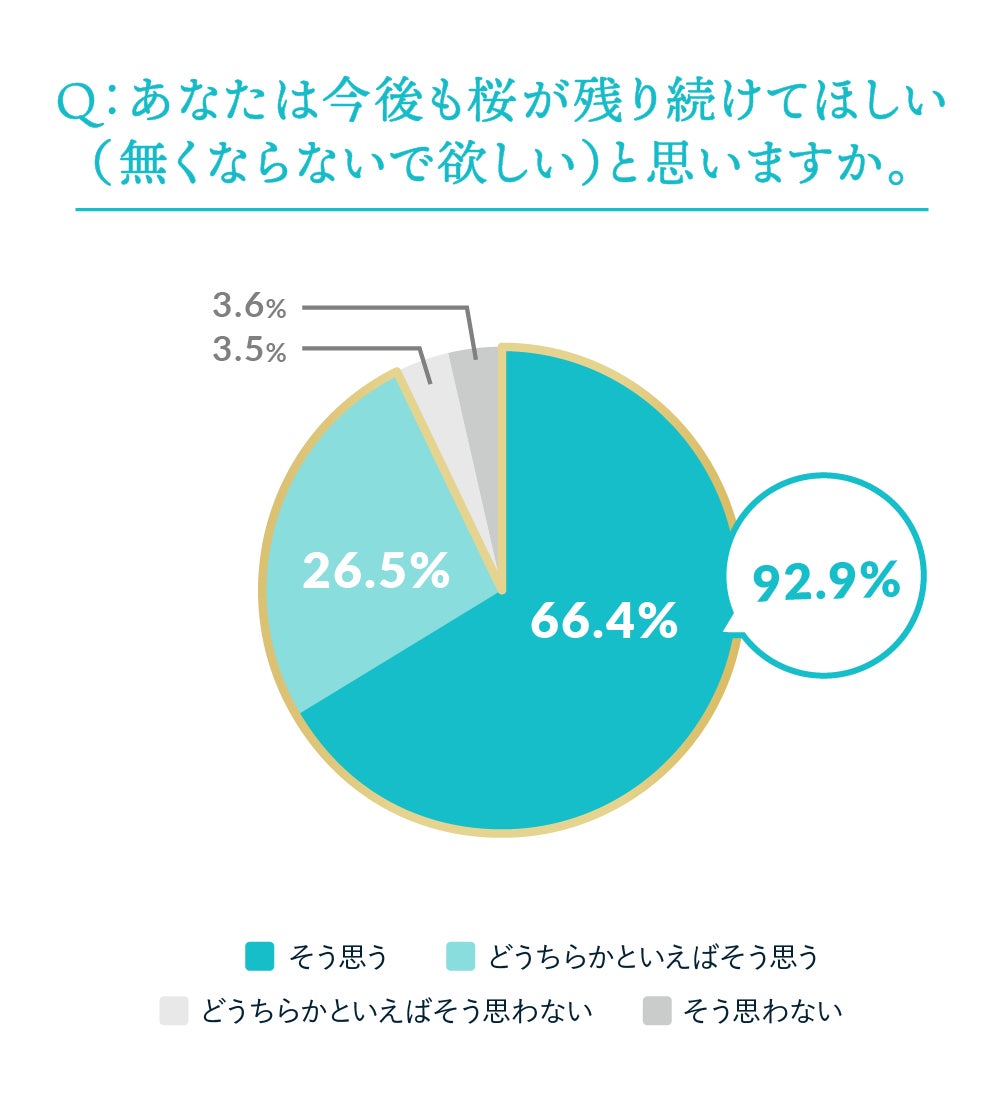 「今後も桜がなくならないでほしい」と回答した人は、「そう思う」66.4%、「どちらかと言えばそう思う」26.5%を合わせて92.9%に達した。その理由としては、「日本の象徴だから」(69.9%)、「景観として価値がある」(66.9%)が上位に挙がり、桜が文化的・象徴的価値を持つ存在として認識されていることが示された。