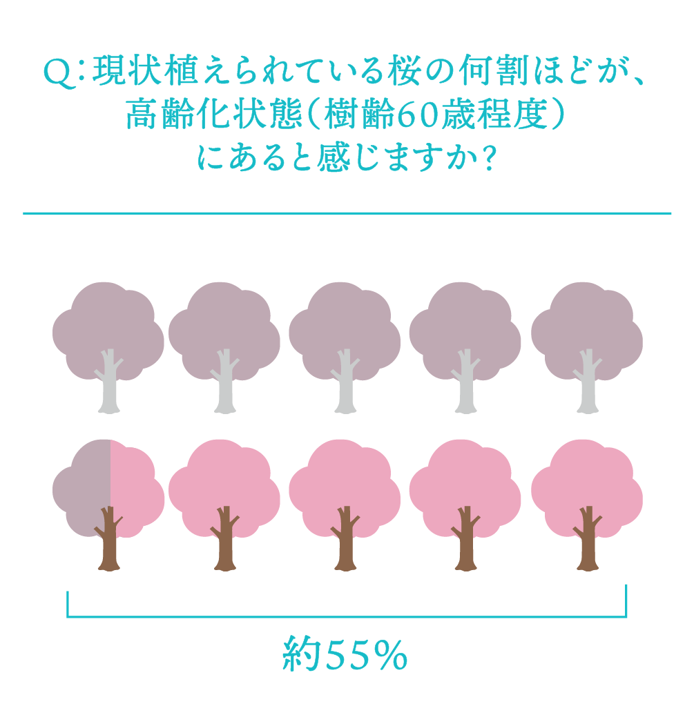 各自治体の回答から、現状植えられている桜のうち約55%が、「高齢化状態(樹齢60歳程度)にある」と推計される。