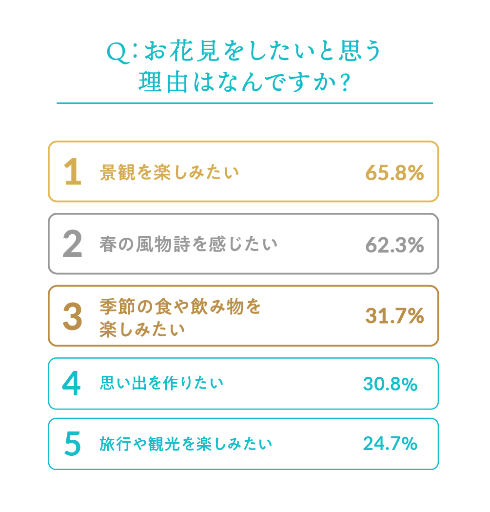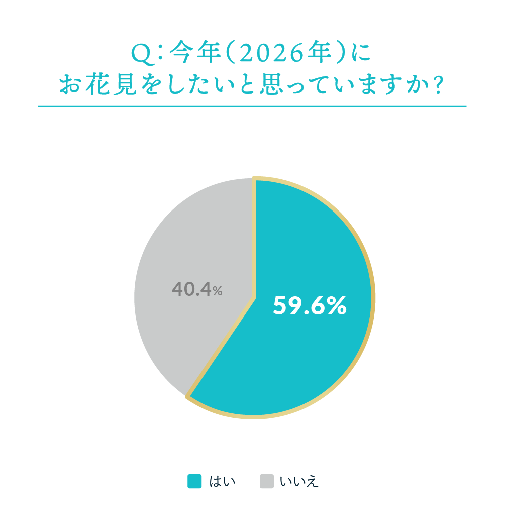 2026年に「お花見をしたい」と回答した人は59.6%にのぼり、過半数が来春のお花見への参加意向を示している。お花見をしたい理由としては「景観を楽しみたい」(65.8%)、「春の風物詩を感じたい」(62.3%)が上位を占め、桜は季節性や視覚的体験と強く結びついた存在であることが示された。