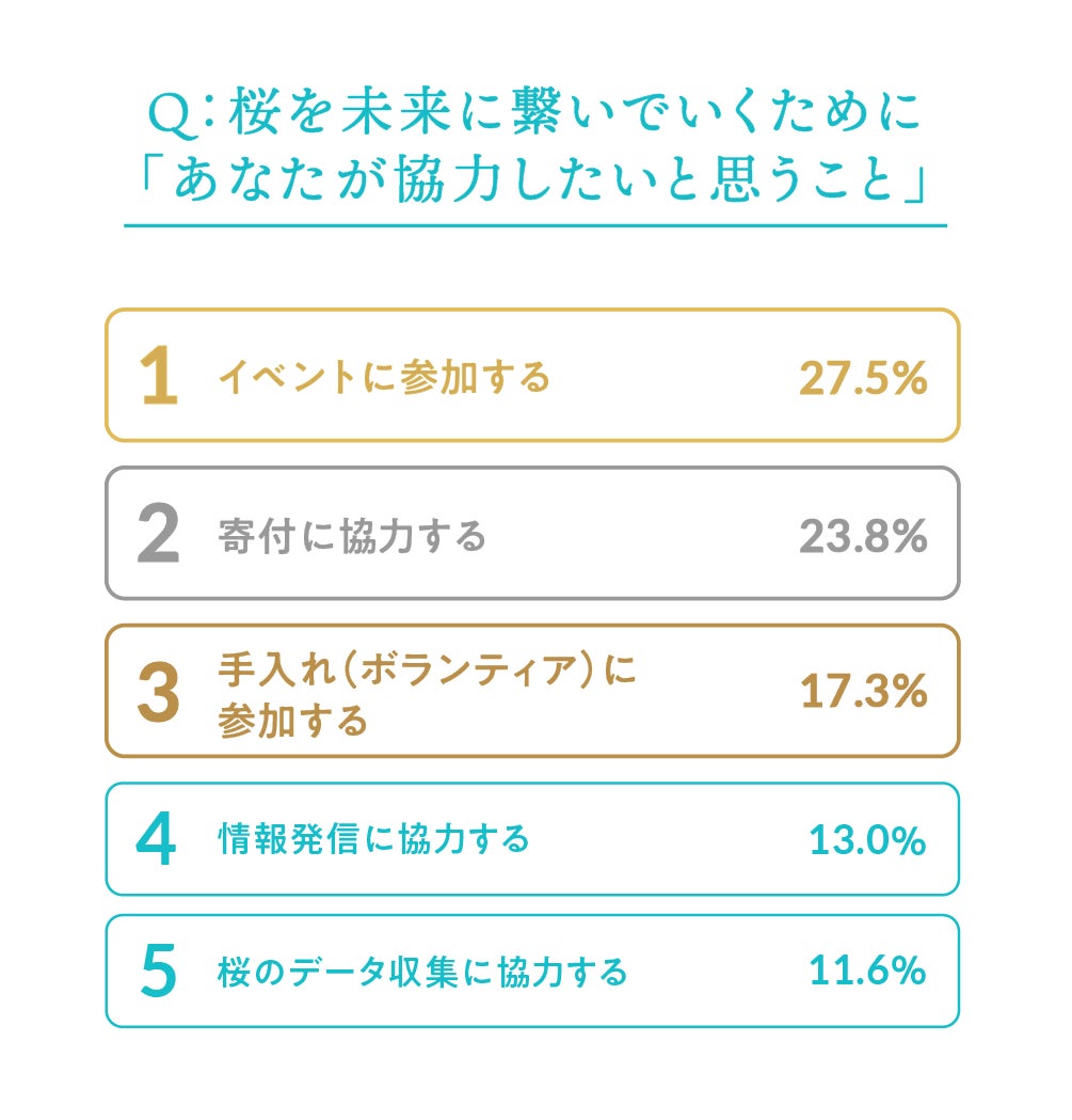 桜を未来に繋いでいくために、「協力したいと思うことがある」と回答した人は全体の61.7%。協力したいこととしては、「イベントに参加する」(27.5%)、「寄付に協力する」(23.8%)が上位に。