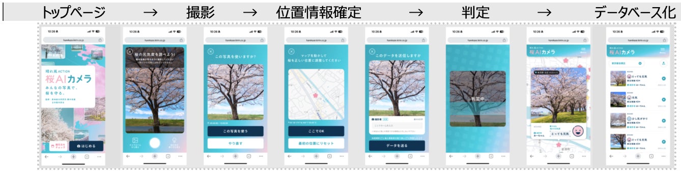 ①スマートフォンで桜の写真を撮影すると、独自に開発したAI技術で桜の健康状態や樹齢を判定します。