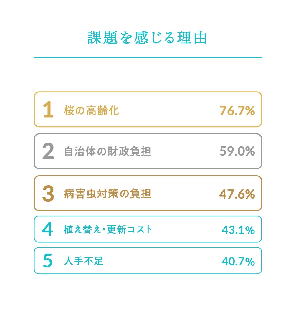 自治体の77.5%が、近年桜の管理に課題を感じていることが明らかに。課題の理由としては、「桜の高齢化」(76.7%)が最も多く、次いで「自治体の財政負担」(59.0%)、「病害虫対策の負担」(47.6%)、「植え替え・更新コスト」(43.1%)が上位に。桜の高齢化が、管理負担の増大を引き起こしている実態が浮き彫りとなった。