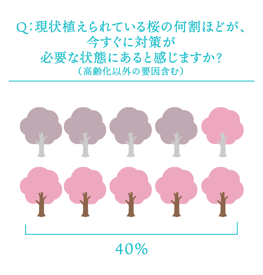 各自治体の回答から、現状植えられている桜のうち約40%が、「今すぐ対策が必要な状況にある」と推計される。
