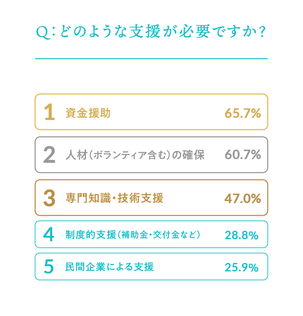 69.9%の自治体が「市民や企業など外部からの支援が必要」と回答。支援内容は「資金援助」(65.7%)、「人材の確保」(60.7%)、「専門知識・技術支援」(47.0%)が上位。