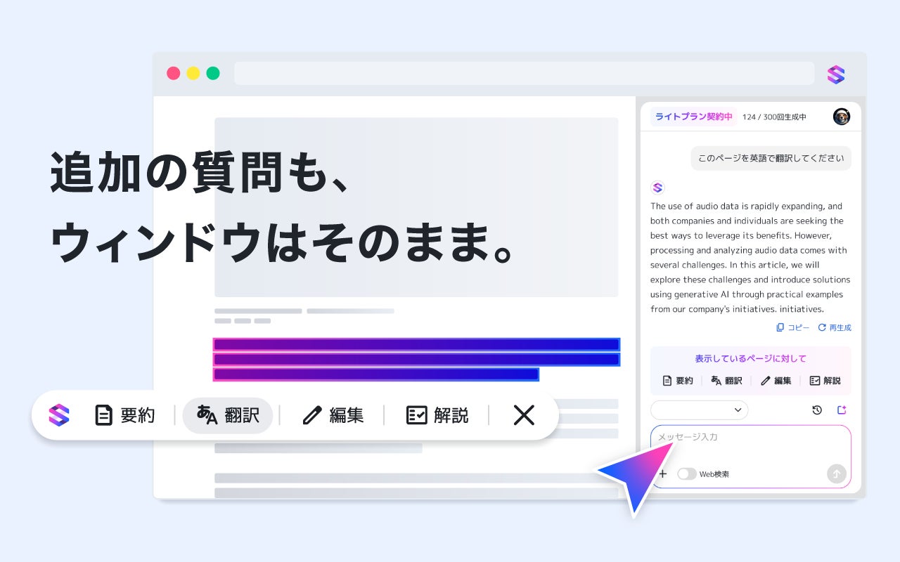 ・ブラウジングしながらワンクリックで生成:WEBページ上のテキストを選択するだけでアクションバーが表示され、生成AIによるアウトプットが可能です。今回の本格提供により、ブラウザ画面のサイドバーに表示されることで、ブラウジングを中断することなく、直感的に生成AIを活用できます。また、サイドバーではサイトを全て選択した上でのワンクリック生成も可能となり、追加の質問もサイドバーでそのまま実施できます。
