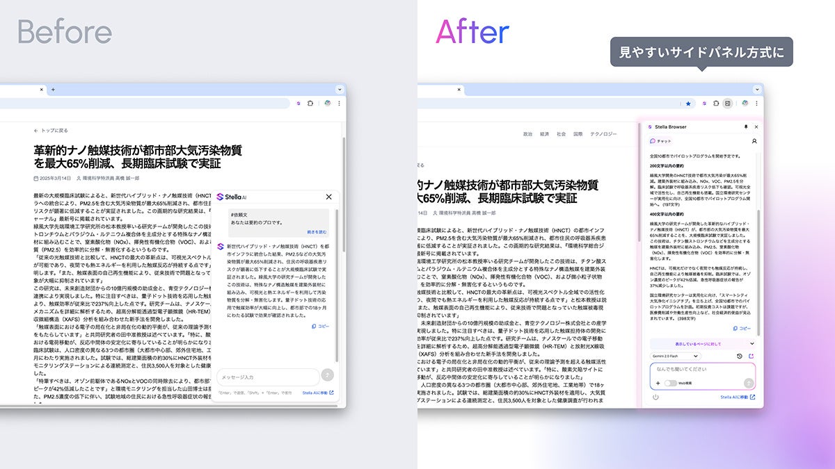 従来のチャット欄はブラウザ上に重なるように表示されていましたが、今回の正式版ではサイドパネル方式を導入しました。これにより、WEBの内容にチャット欄が被ることもなく、チャット欄を常時表示させながらブラウジングが可能となりました。