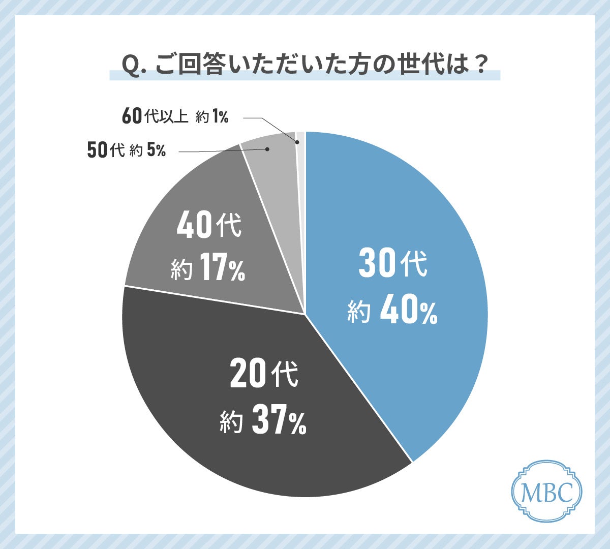 「回答者の年齢をお答えください」とアンケート調査した結果、30代(40%)、20代(37%)、40代(17%)、50代(5%)、60代(1%)でした。