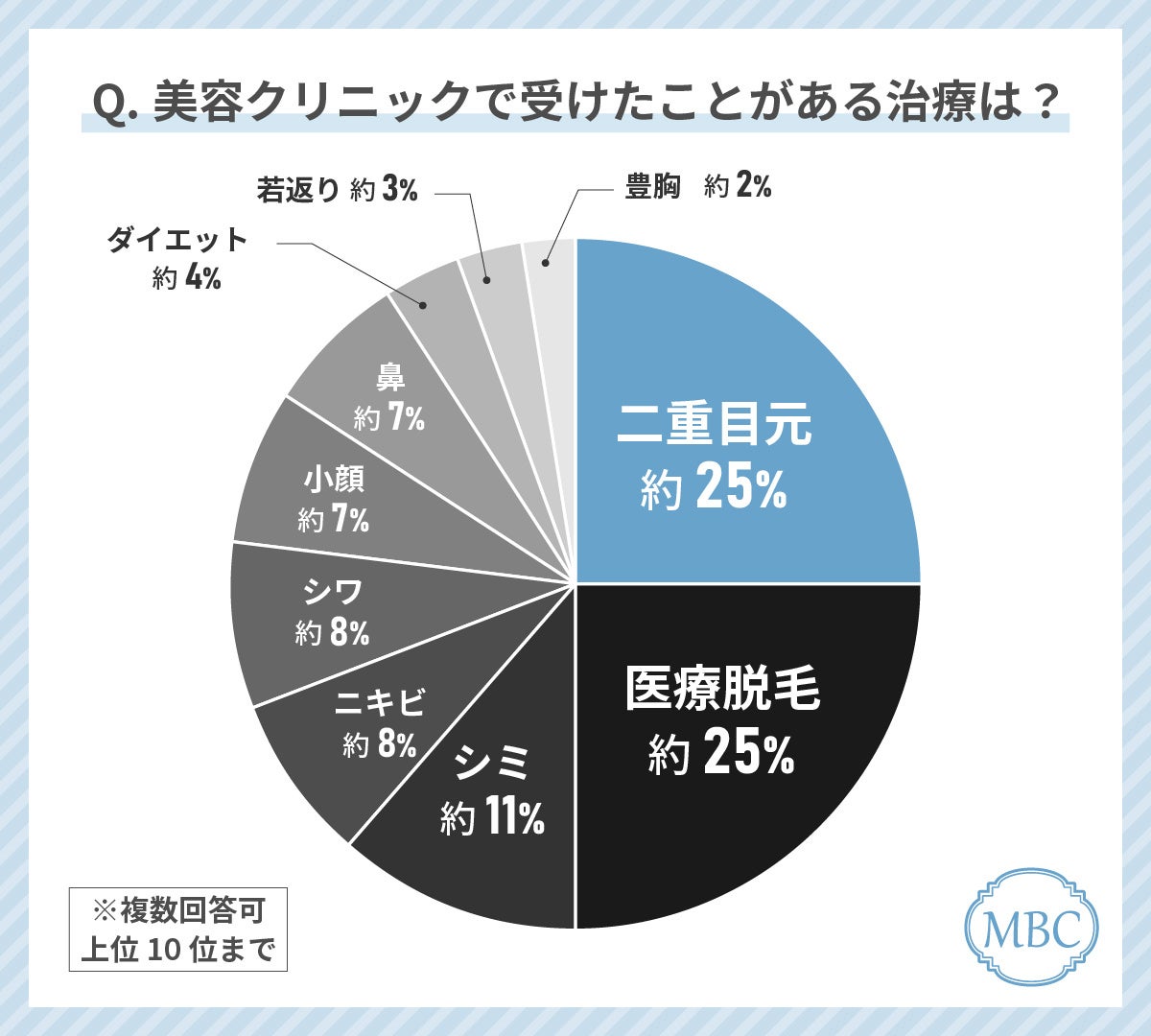 「今までに美容クリニックで受けたことがある治療は何ですか?※複数回答可」とアンケート調査した結果、