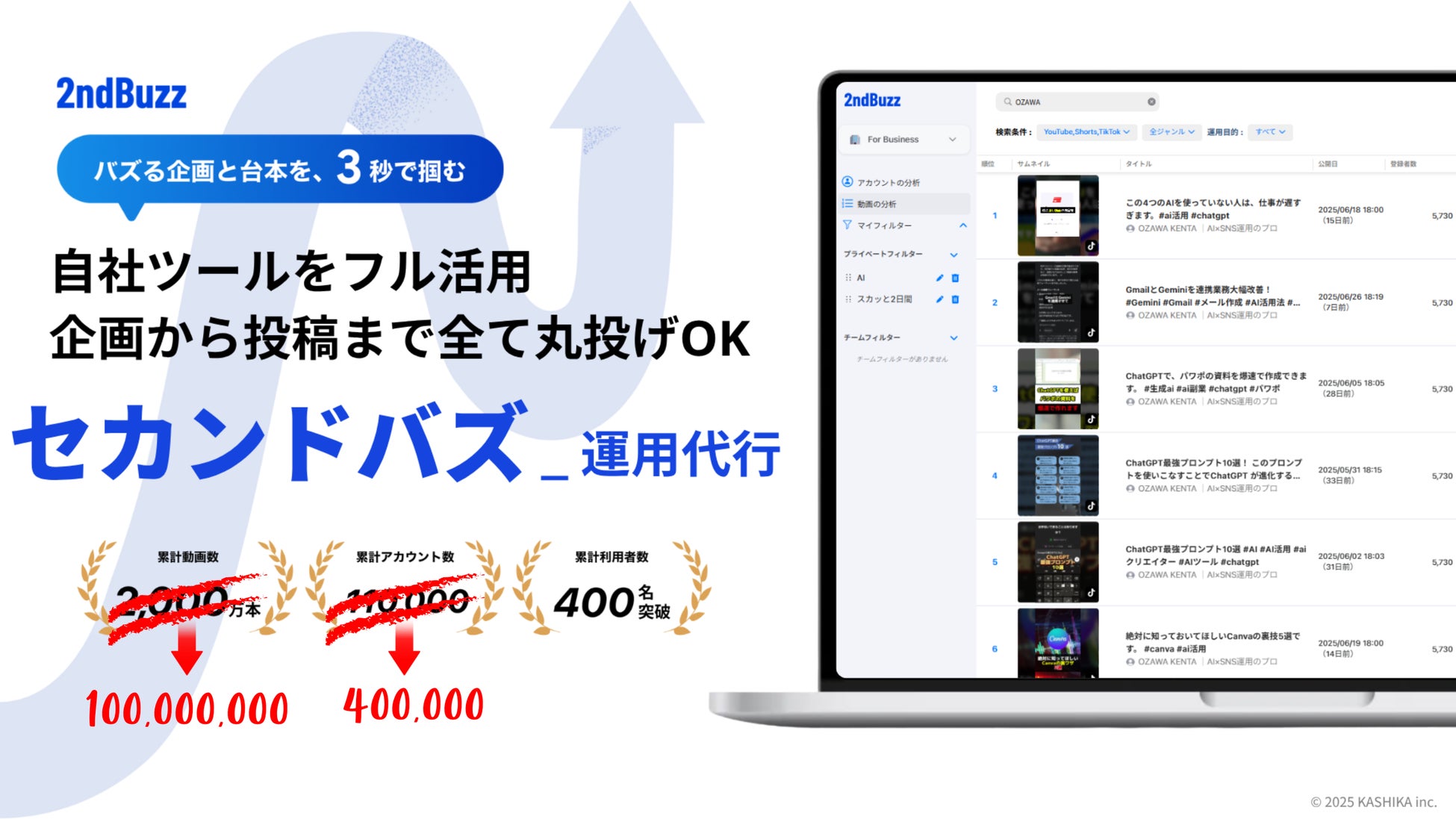 【SNS分析ツール決定版】セカンドバズ、分析対象データ1億件突破!YouTube・TikTokのトレンド分析を強化し、再現性の高いSNSマーケティングの”丸投げ内製化”を実現