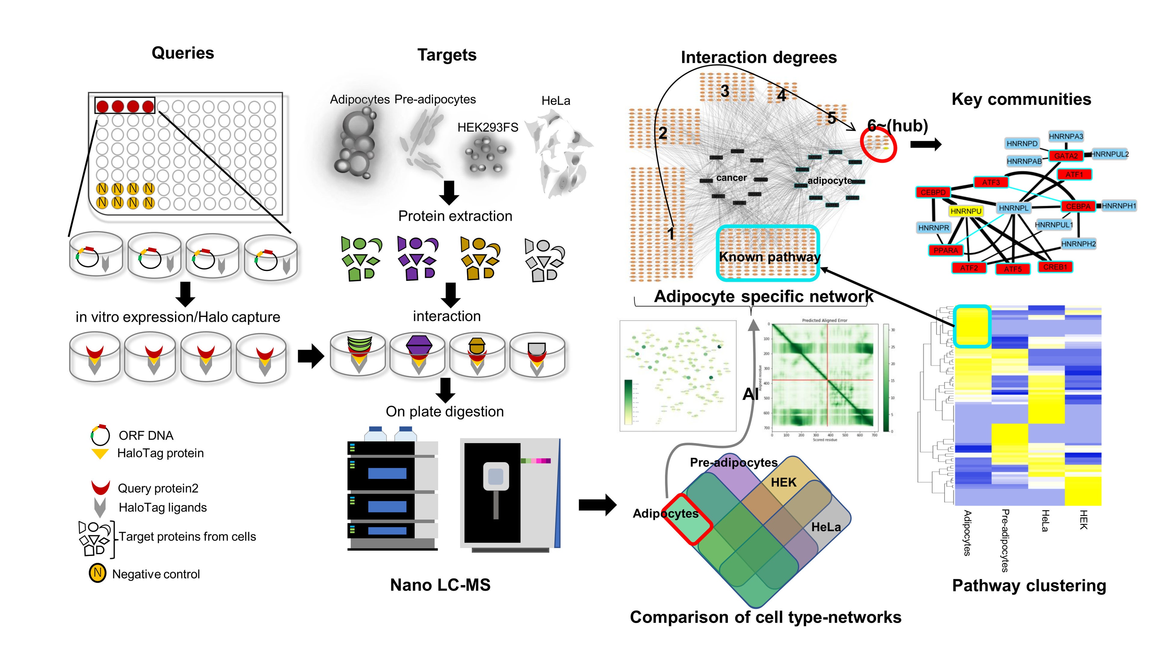 HaloMS法を用いたたんぱく質間相互作用の発見:たんぱく質間相互作用探索のためにハイスループット技術HaloMSを開発した。これにより、新たな相互作用たんぱく質を迅速に捕捉できるようになった。ヒト脂肪細胞におけるたんぱく質複合体検出のためにHaloMSとAIを用いて、分子ネットワークがどのように統合されているかが明らかになった。