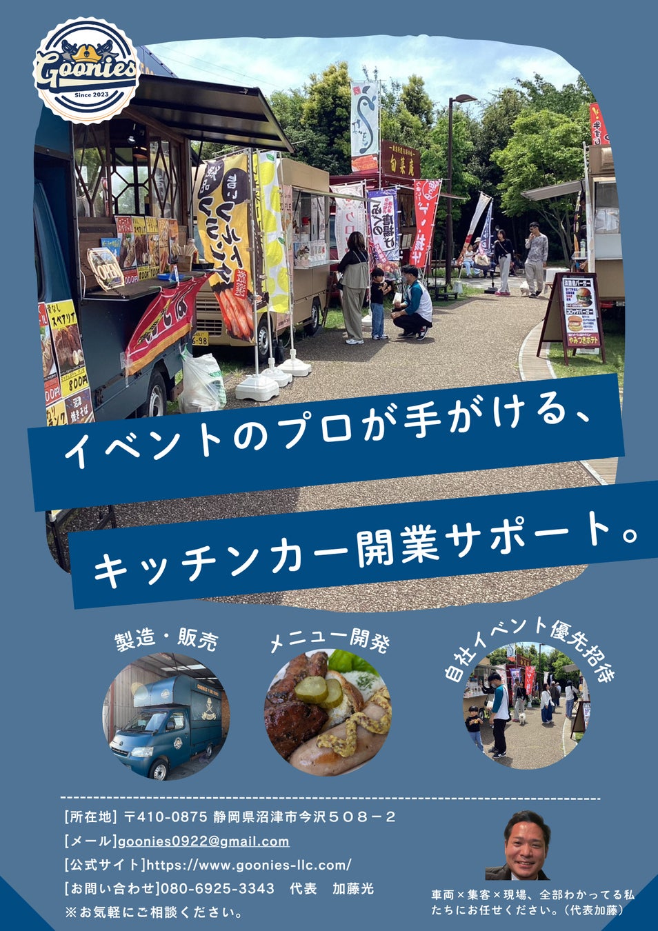 今回の「富士キッチンカーフェス in 中央公園2025」の企画・運営・広報・集客に携わるのは、静岡県 沼津市拠点とするグーニーズ合同会社。