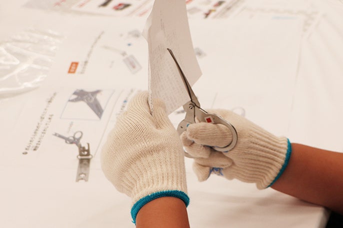 当社の板金マシンで加工した1枚のステンレス板からハサミを組み立てました。組み立てに必要なナットやボルト、工具もすべて1枚板からできており、手作業で組み立てられるよう加工されていることに、驚きの声が上がっていました。難しい部分は保護者の方やスタッフが手伝いながら完成。できあがったハサミは使いやすく切れ味が良いと好評でした。